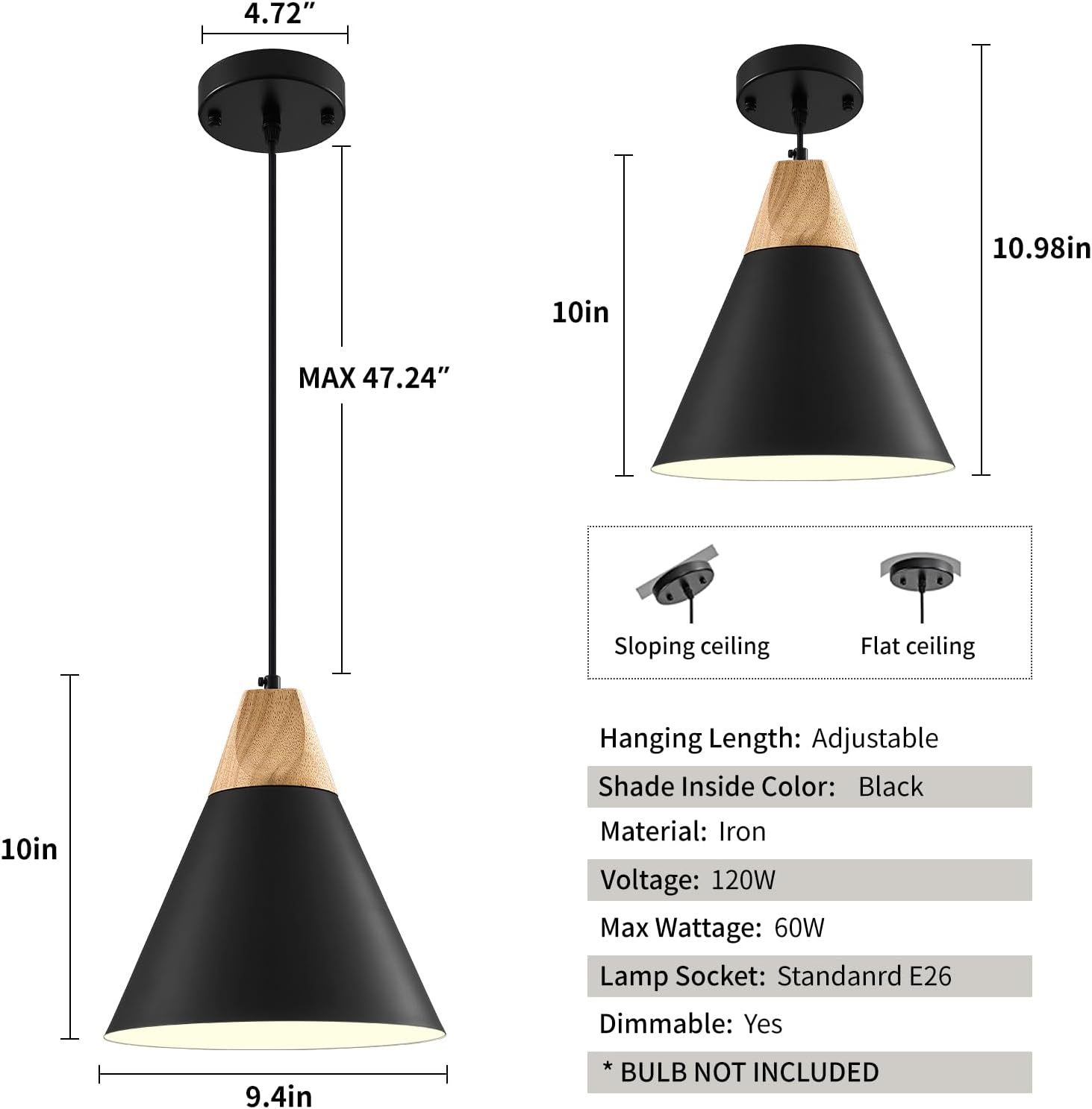 Black Pendant Light 2 Packs,9.4inches- Farmhouse Pendant Light, Industrial Pendant Lights, Kitchen Pendant Lights for Office, Bedroom, Living Room, Kitchen Island