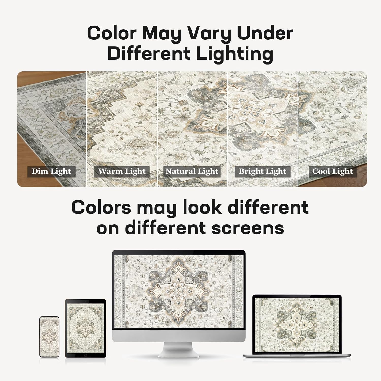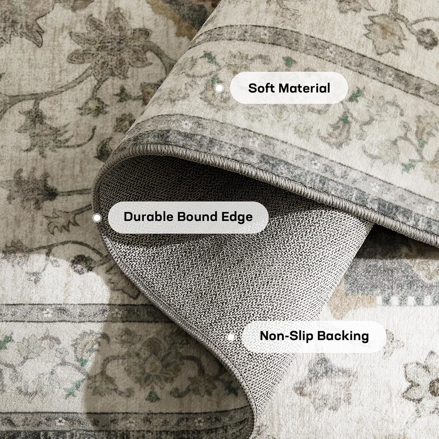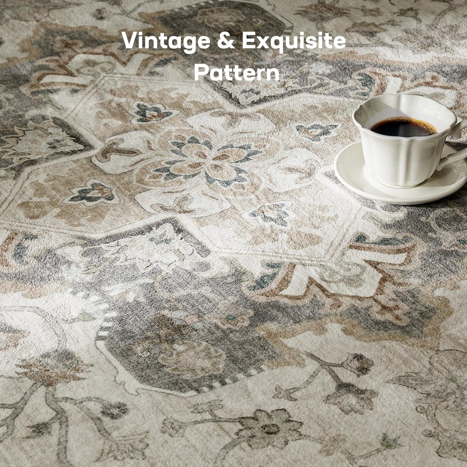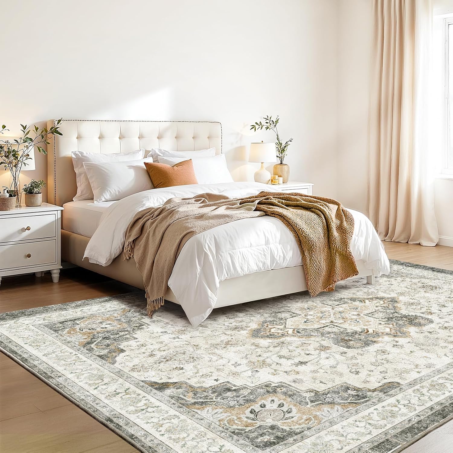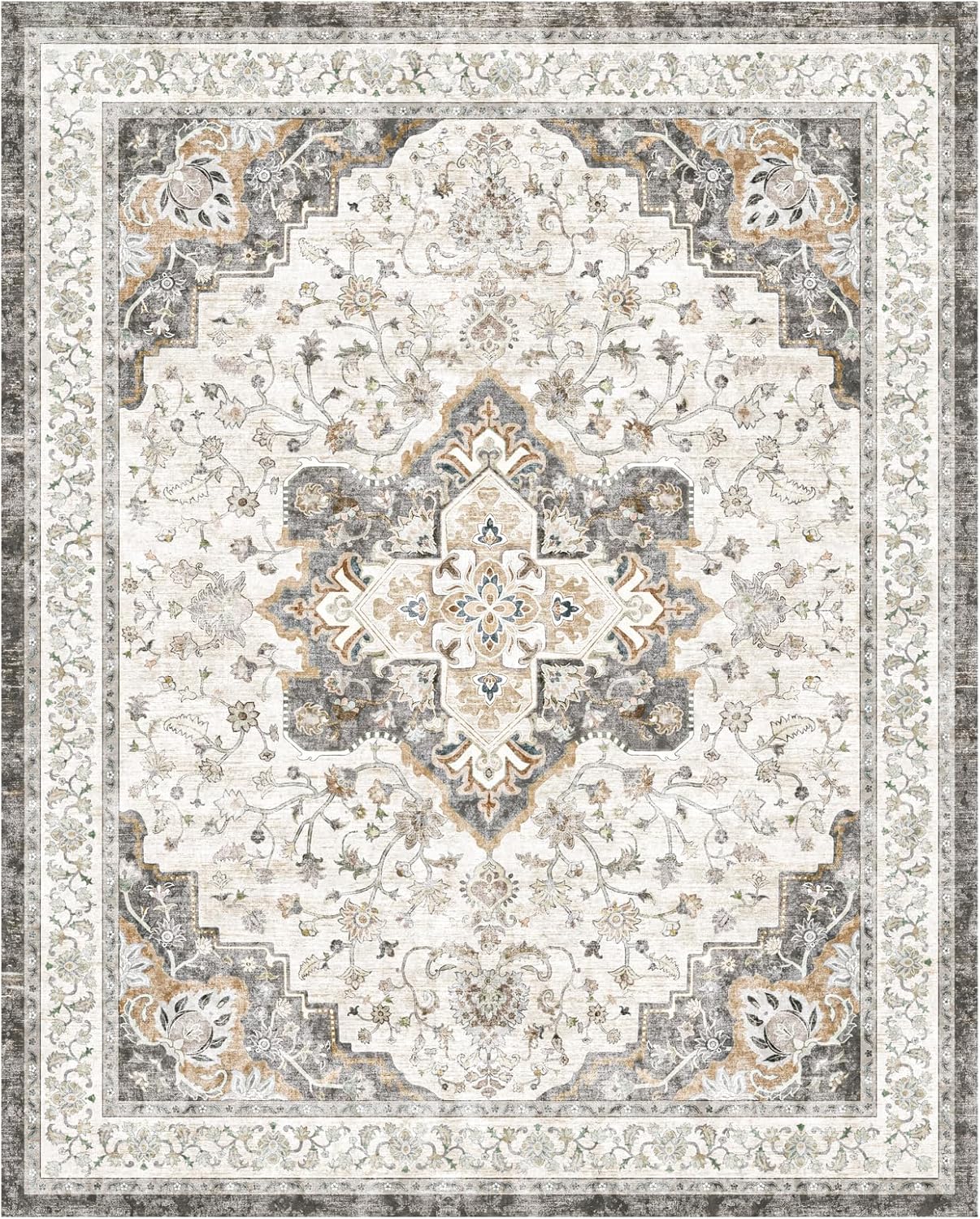 Marsail 8×10 Machine Washable Area Rug, Soft & Slip-Resistant Large Area Rug with Reinforced Bound Edges, Vintage Short-Pile Washable Rug with Floral Pattern for Living Room, Dinning Room and Bedroom
